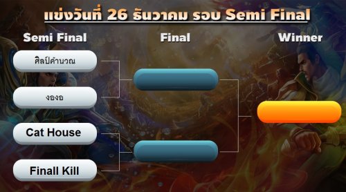4ทีมทั้งหมดได้แก่ ทีม ศิลป์คำนวณ จากร้าน บอยเน็ต , ทีมงอง จากร้าน Login 2 , ทีม Cat House จากร้าน Pure Speed และ ทีม Final★Kill , ร้าน Counternet ซึ่งทั้ง 4 ทีมจะแข่งขันกันในวันที่ 26 ธ.ค. หรือพรุ่งนี้นั้นเอง ติดตามการแข่งขันได้เลย !!